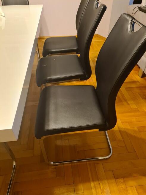 Sprzedam krzesla 8 sztuk.Kolor czarny. Jak widać na zdjęciu na niektórych krzesłach schodzi i pęka ekoskóra. Nadają ...
